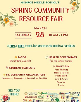 JOIN US...at Monroe Middle School for a Spring Community Resource Fair. Saturday, March 28 from 10:00 a.m. - 1:00 p.m. ÚNASE A NOSOTROS... en la Escuela Secundaria Monroe para una Feria de Recursos Comunitarios de Primavera. Sábado 28 de marzo de 10:00 a.m. a 1:00 p.m.